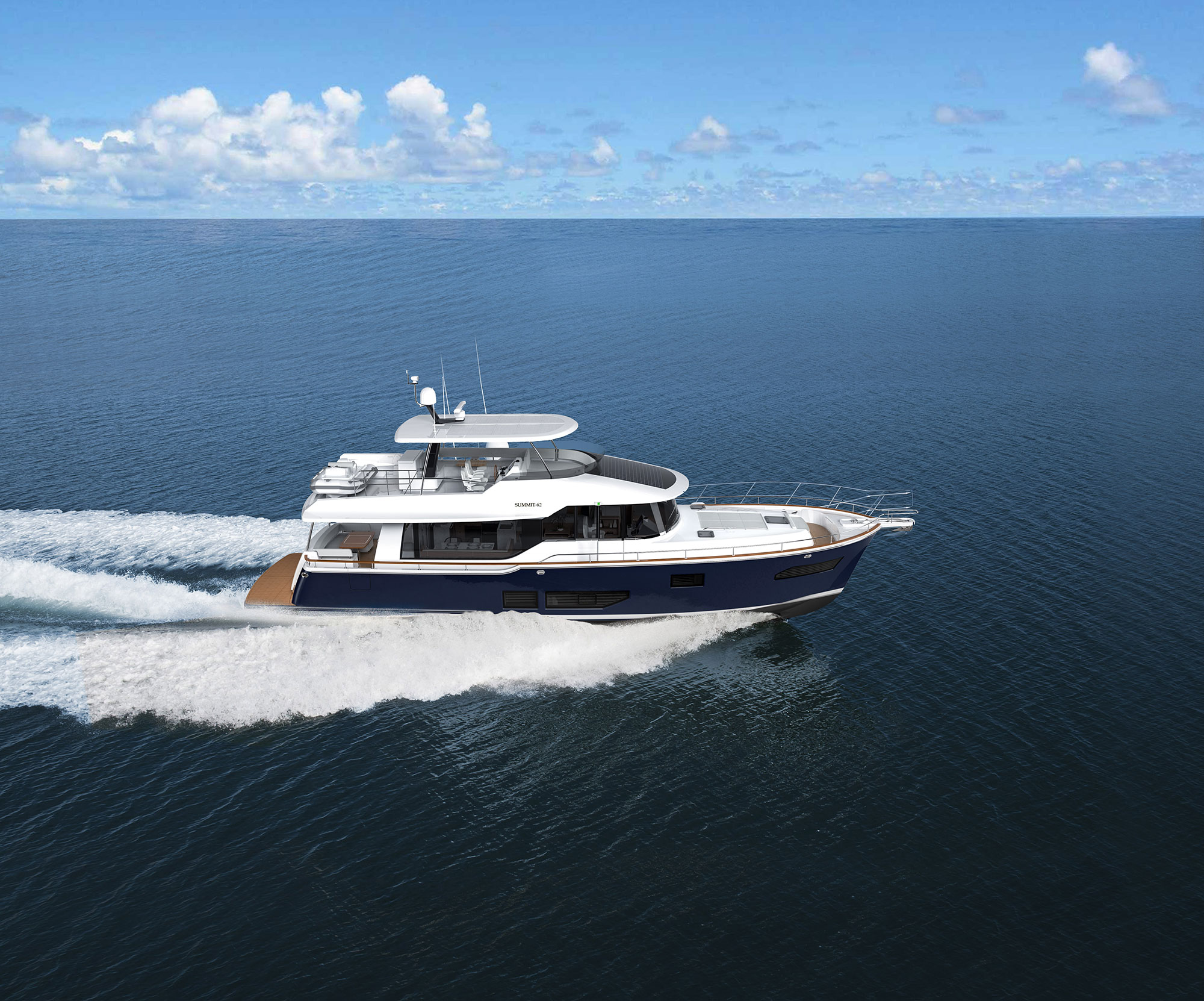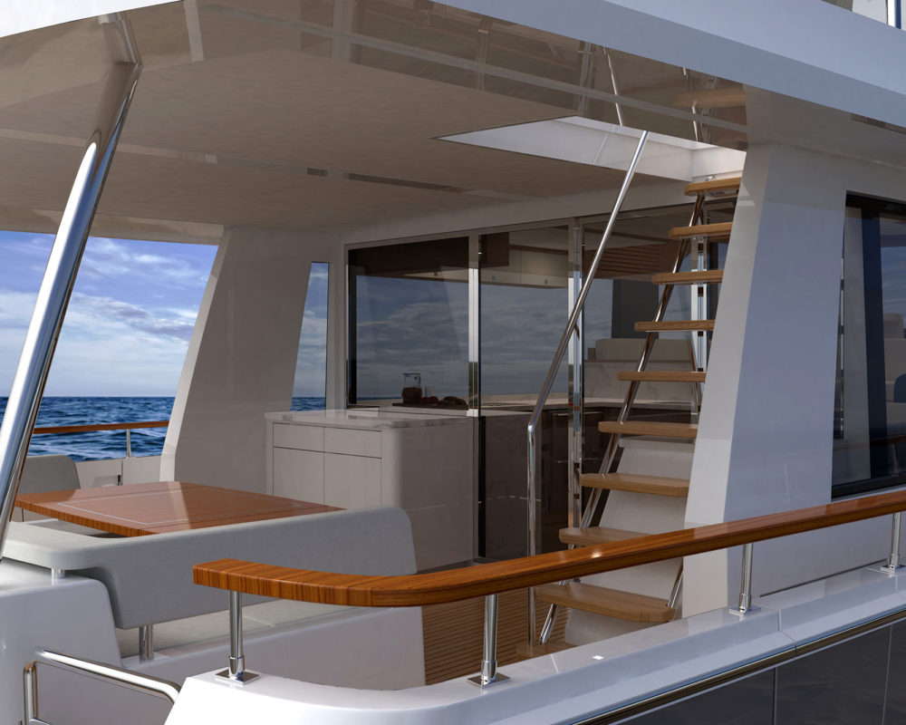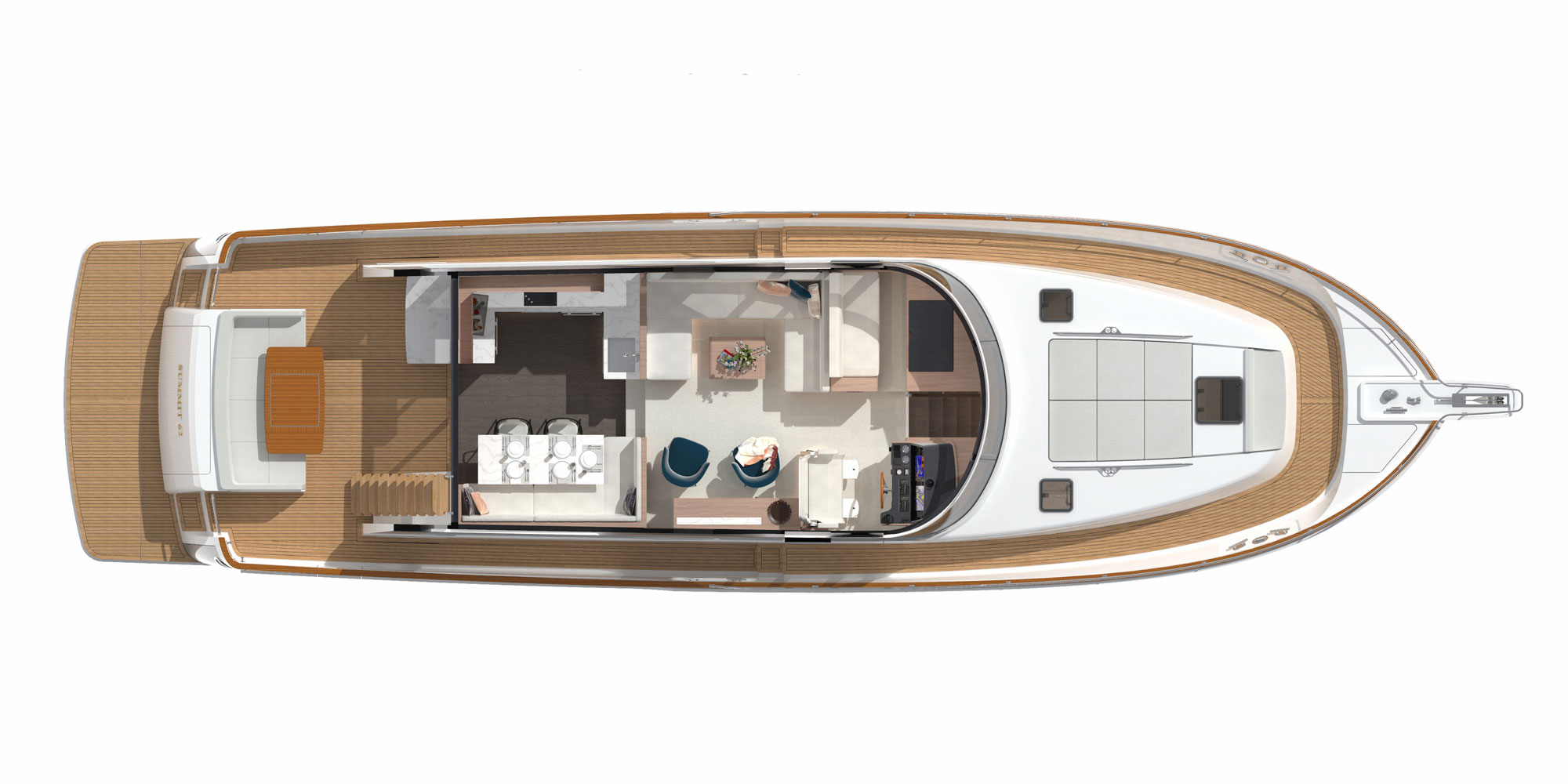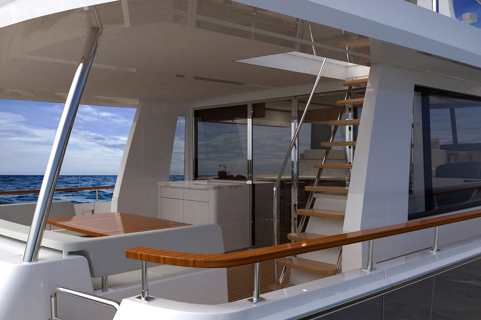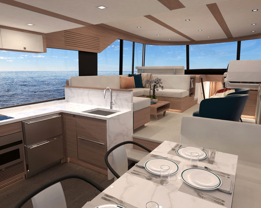Michael Peters designed a performance planing hull that will offer the kind of volume an experienced owner-operator seeks, and the design team envisioned a creative way to work all of Summit’s established principles into a singular layout, including a generous aft deck that connects seamlessly with the galley through large sliding glass doors.