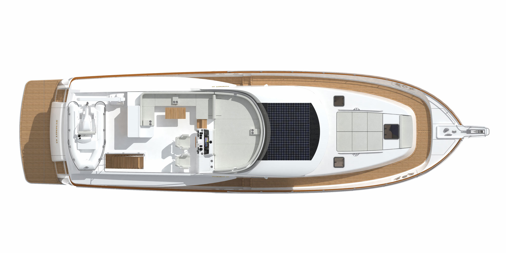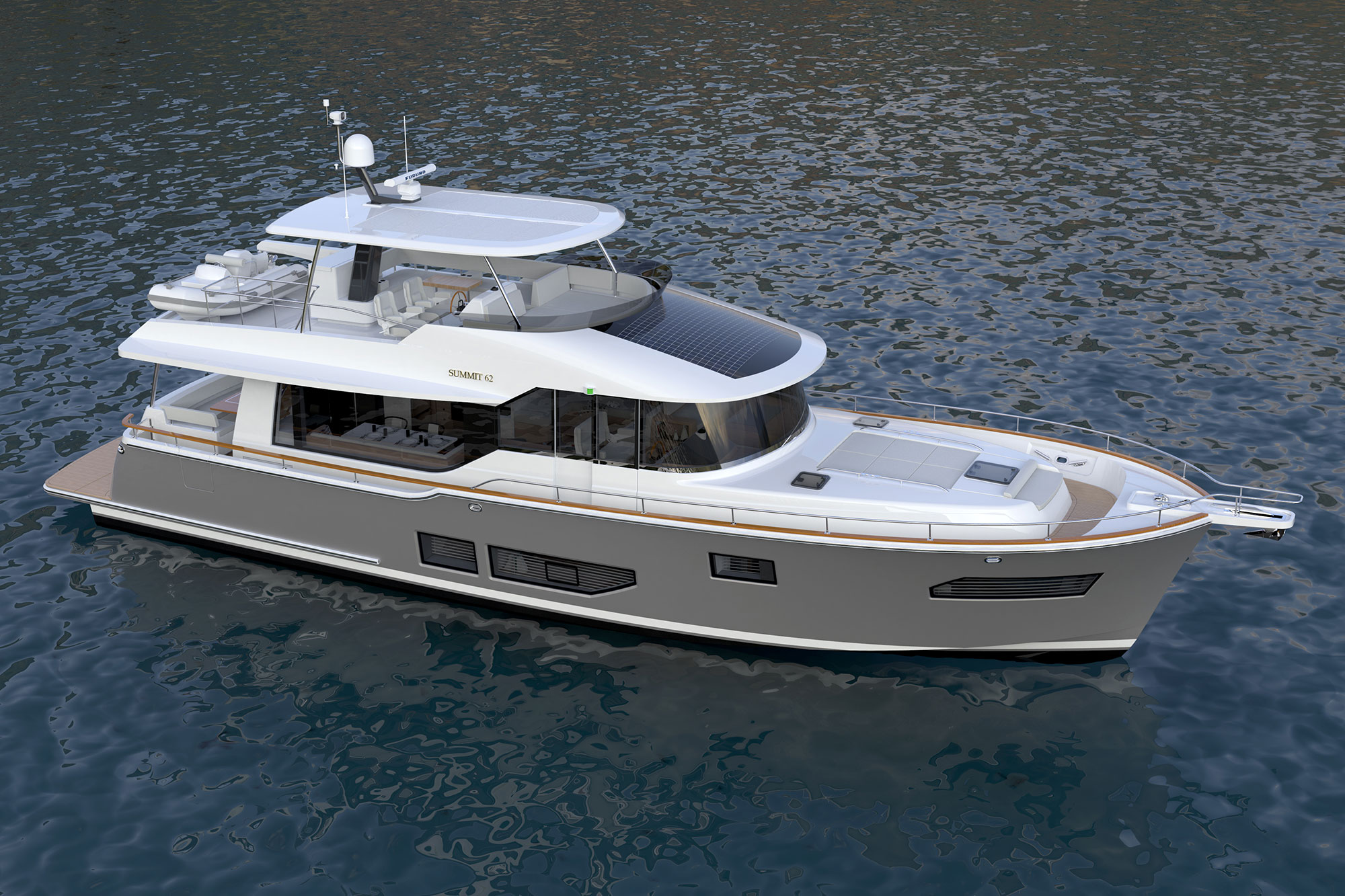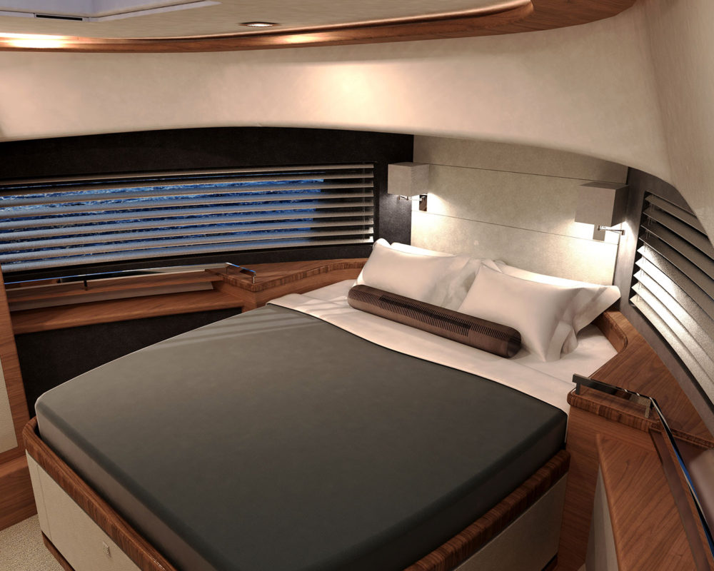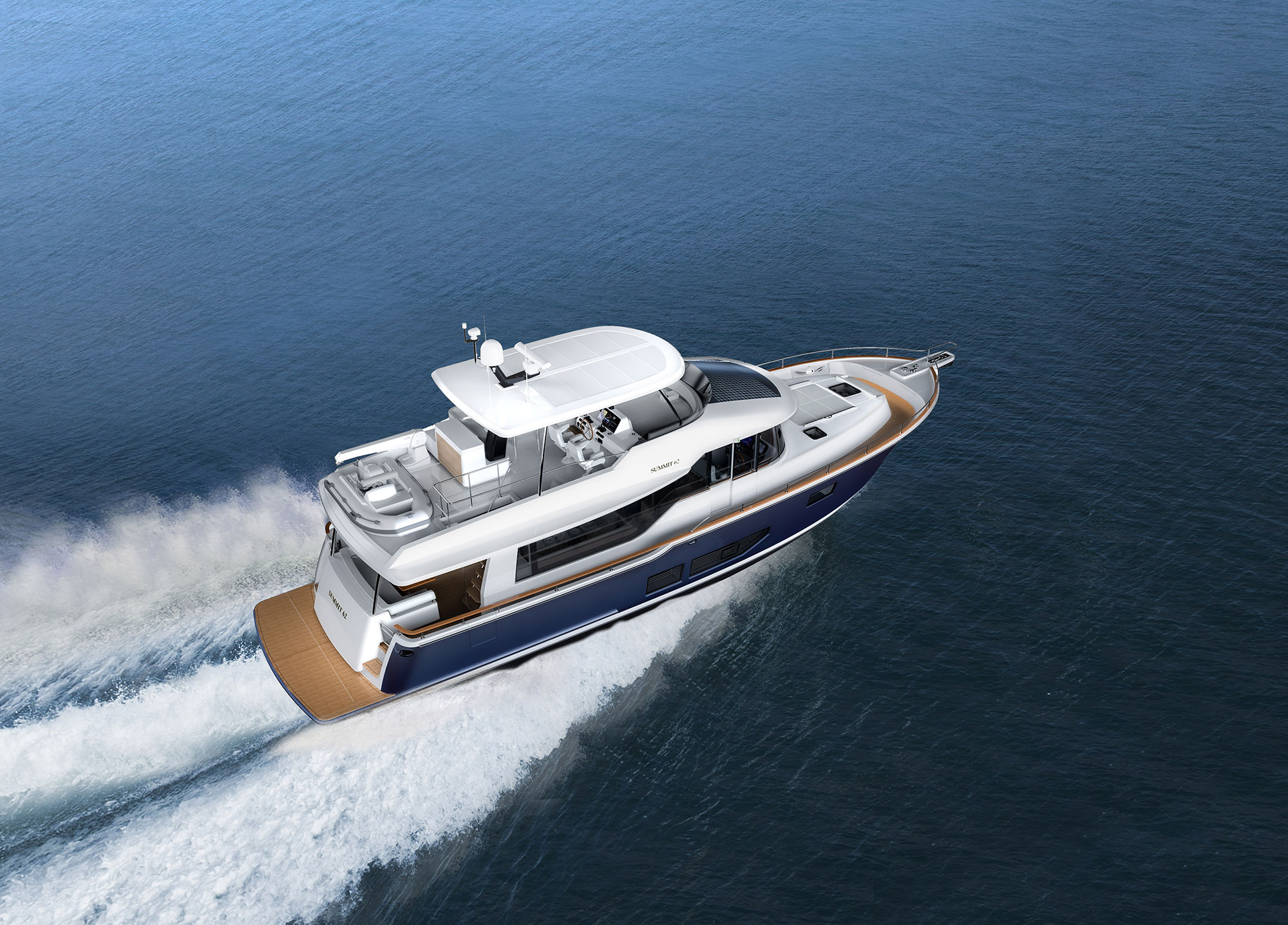 Michael Peters designed a performance planing hull that will offer the kind of volume an experienced owner-operator seeks, and the design team envisioned a creative way to work all of Summit’s established principles into a singular layout, including a generous aft deck that connects seamlessly with the galley through large sliding glass doors.