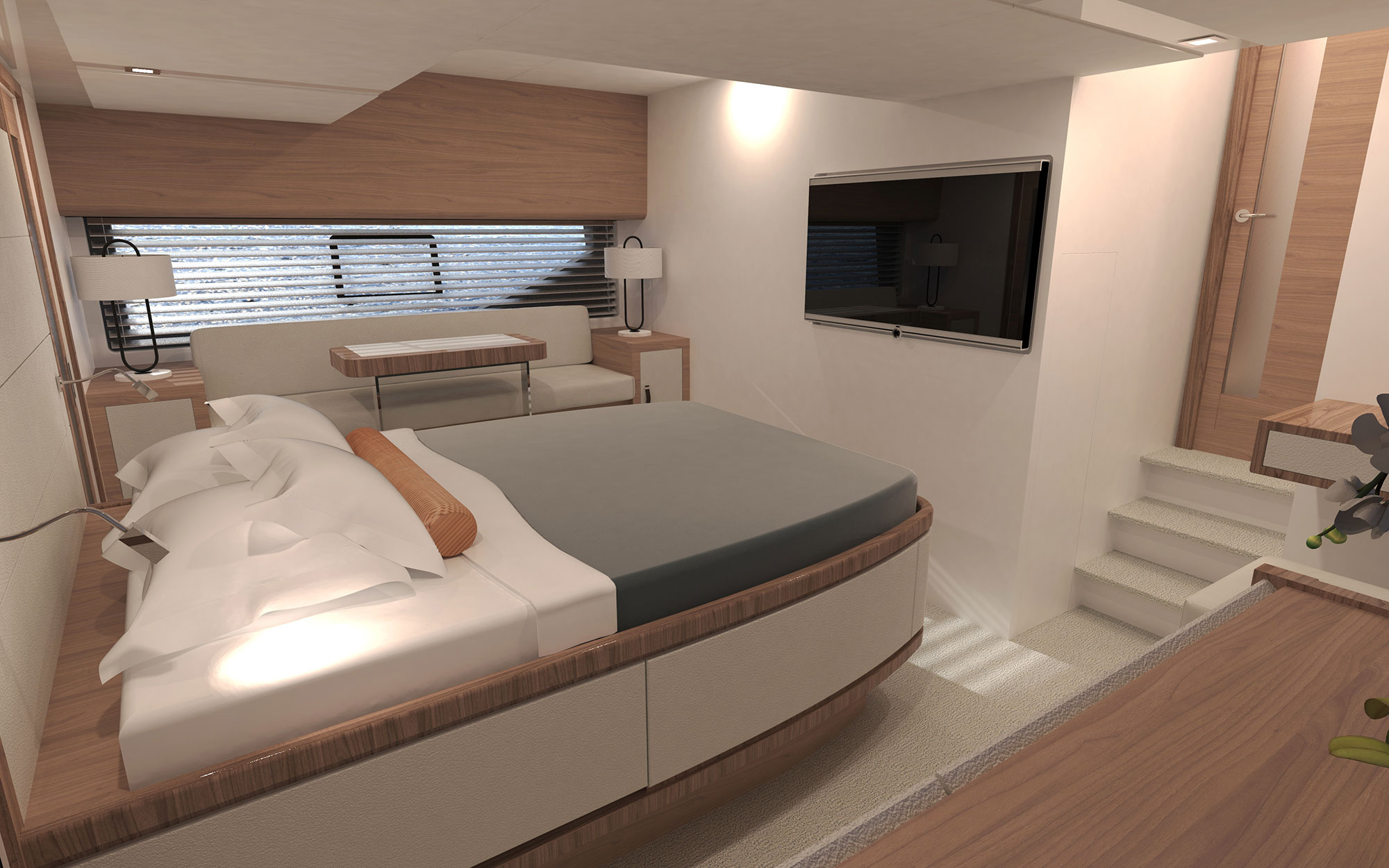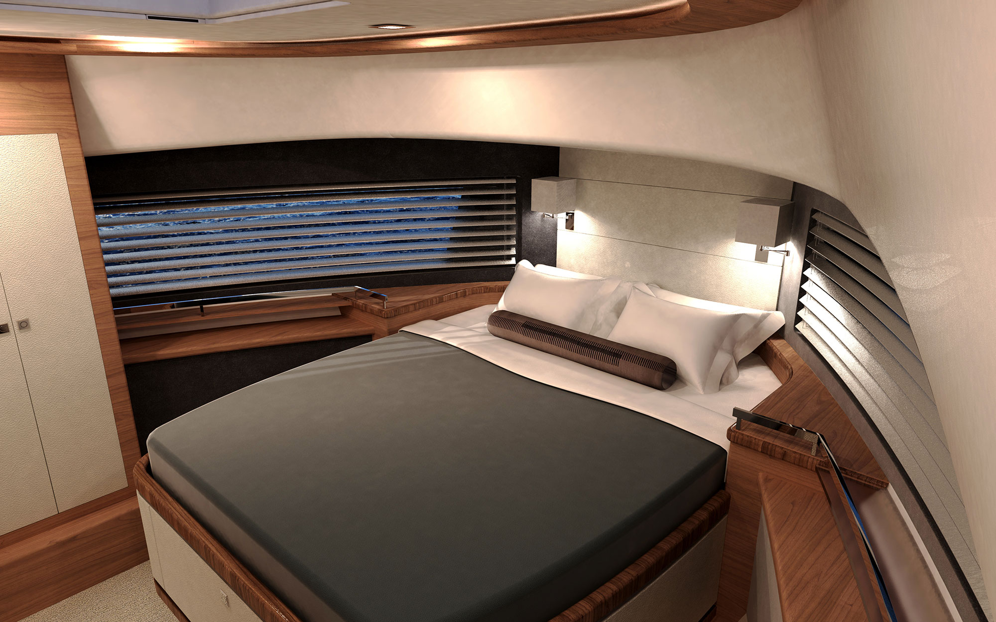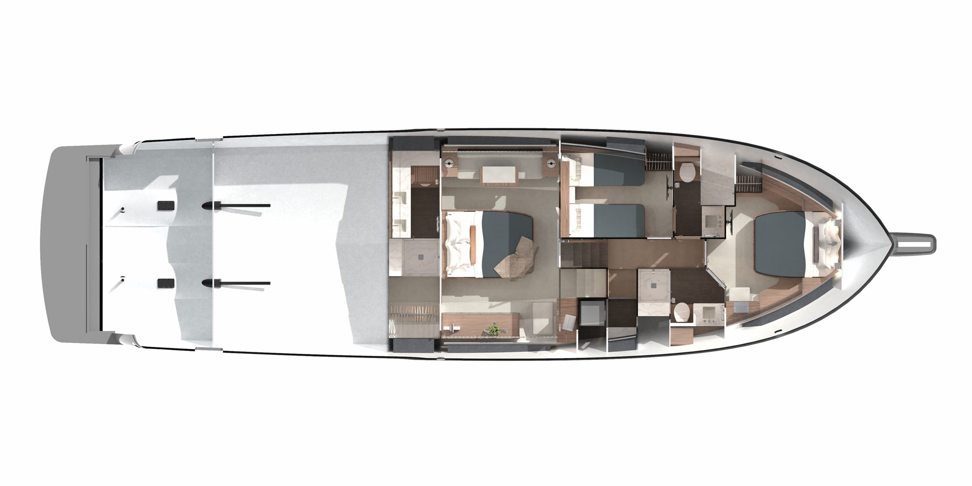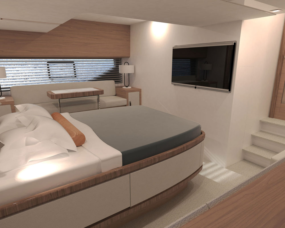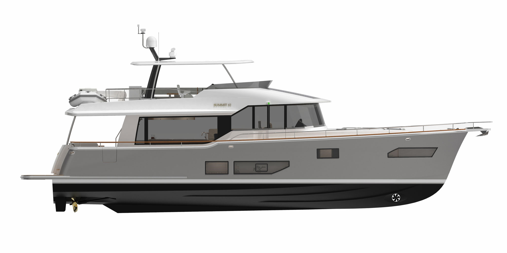 Michael Peters designed a performance planing hull that will offer the kind of volume an experienced owner-operator seeks, and the design team envisioned a creative way to work all of Summit’s established principles into a singular layout, including a generous aft deck that connects seamlessly with the galley through large sliding glass doors.