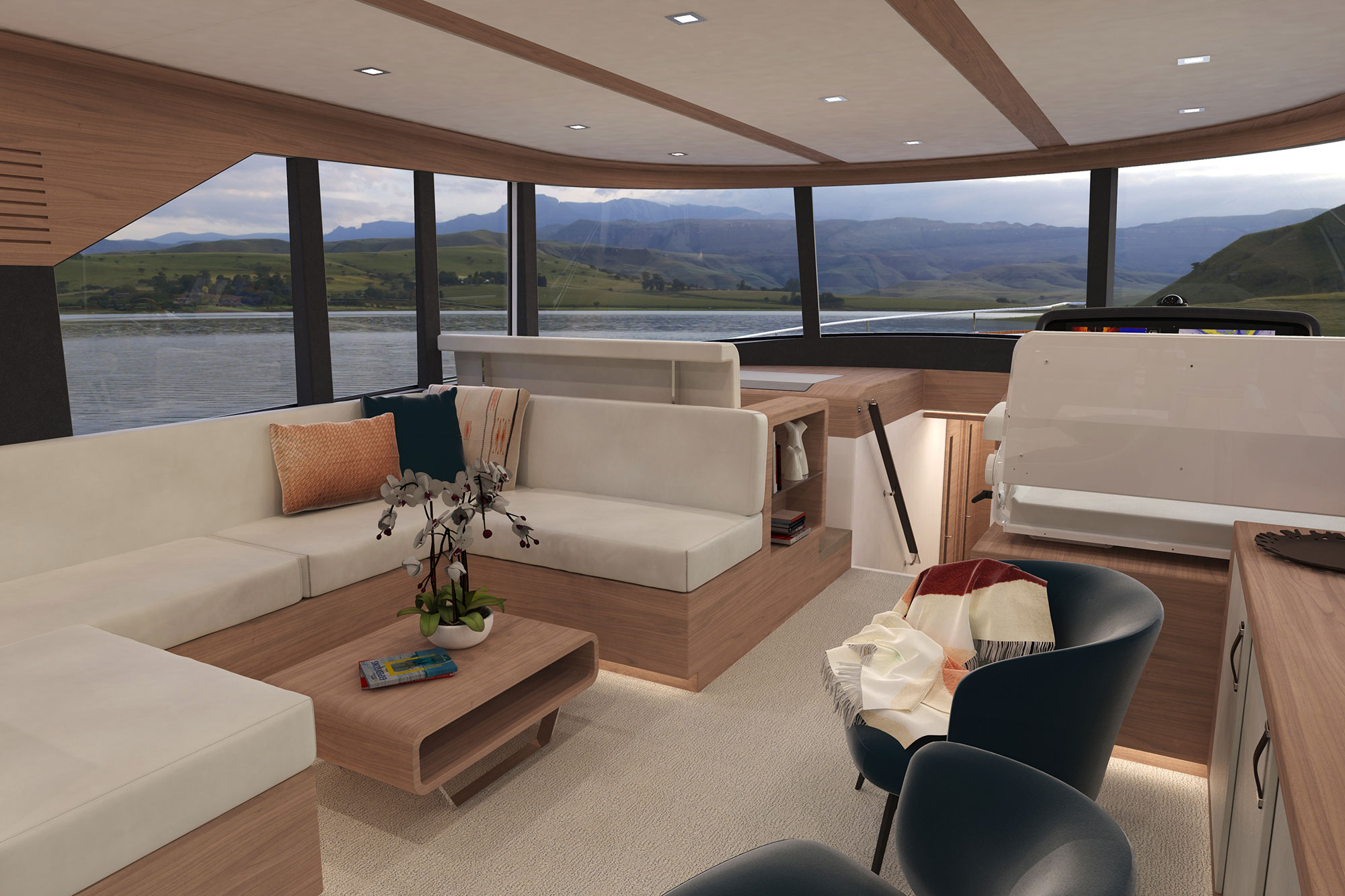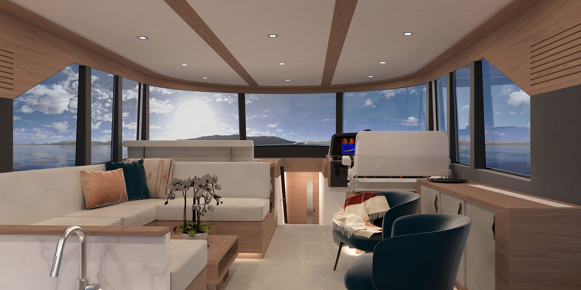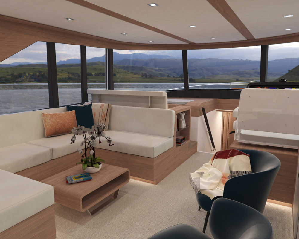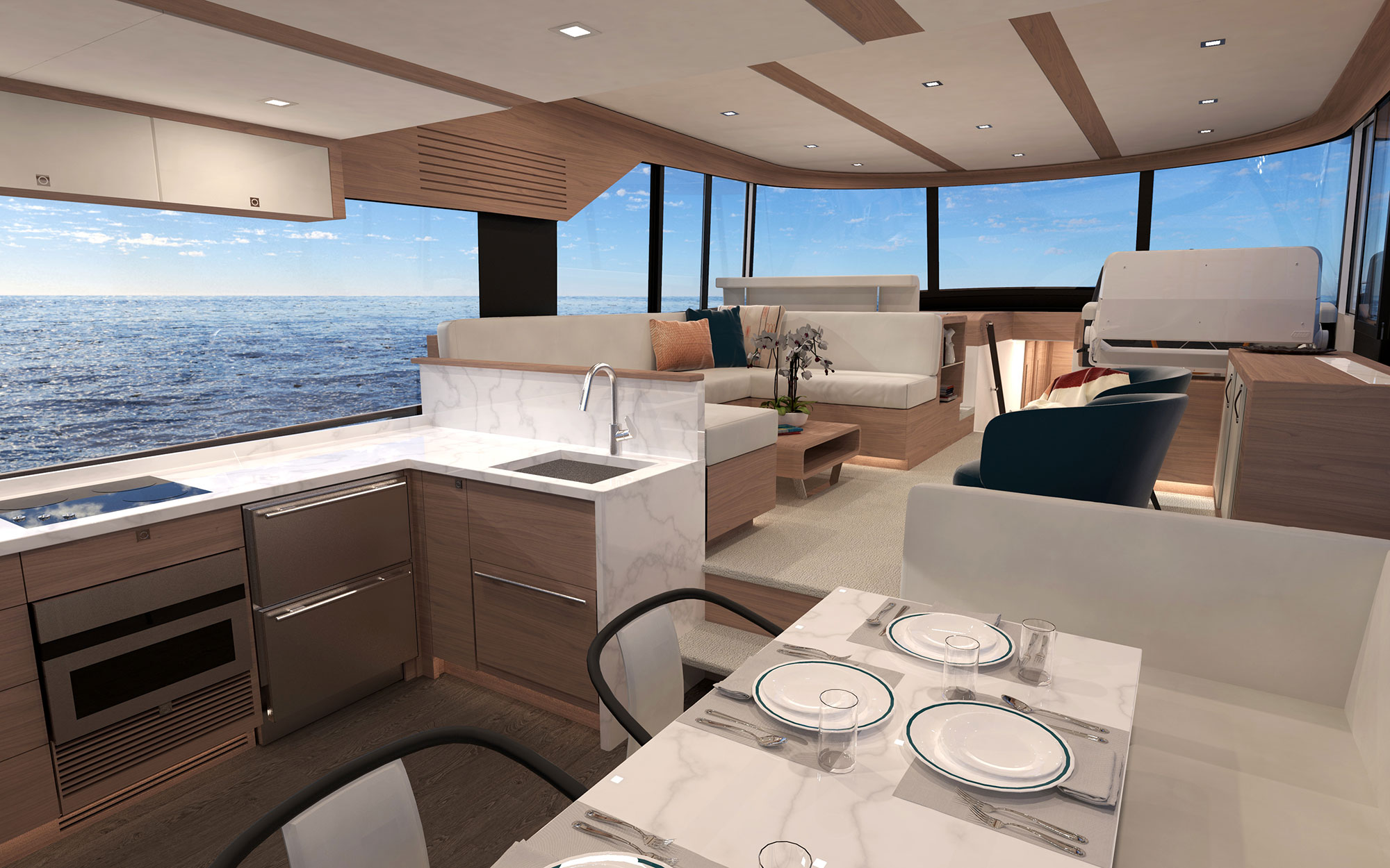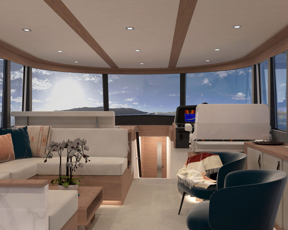 The expansive glass stretches forward along both sides and connects with the windshield at the helm, bathing the entire space in natural light and surrounding family and friends with the best available views.